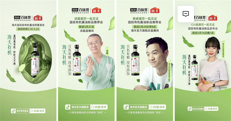 中華老字號品牌海天則將產(chǎn)品生產(chǎn)的“幕后”過程搬到了“臺前”,向觀眾進行展示:海天邀請抖音上的知名達人cici888成為了自己的“新品開價官”,并邀請其參觀工廠,與海天電商經(jīng)理一起為有機新品開價,用全新的第三方視角,向觀眾展示自己的“有機產(chǎn)品力”。以這樣一場極“接地氣”的新品發(fā)布會為起點,海天有機新品最終累計收獲超1億人氣。