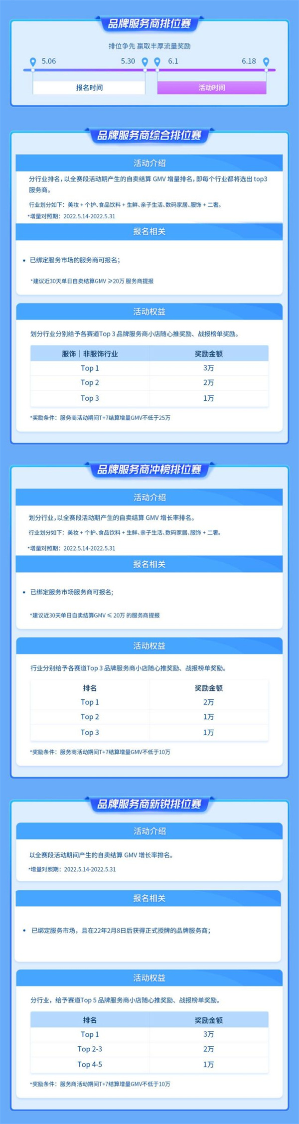 品牌服務(wù)商新銳排位賽,只限已綁定服務(wù)市場(chǎng)且在2022年2月8日后獲得正式授牌的服務(wù)商參與。根據(jù)全賽段活動(dòng)期產(chǎn)生的自賣結(jié)算GMV增長(zhǎng)率排名,Top1、Top2-3、Top4-5的品牌服務(wù)商將分別獲得3萬元、2萬元、1萬元的隨心推獎(jiǎng)勵(lì)、戰(zhàn)報(bào)榜單獎(jiǎng)勵(lì)。
