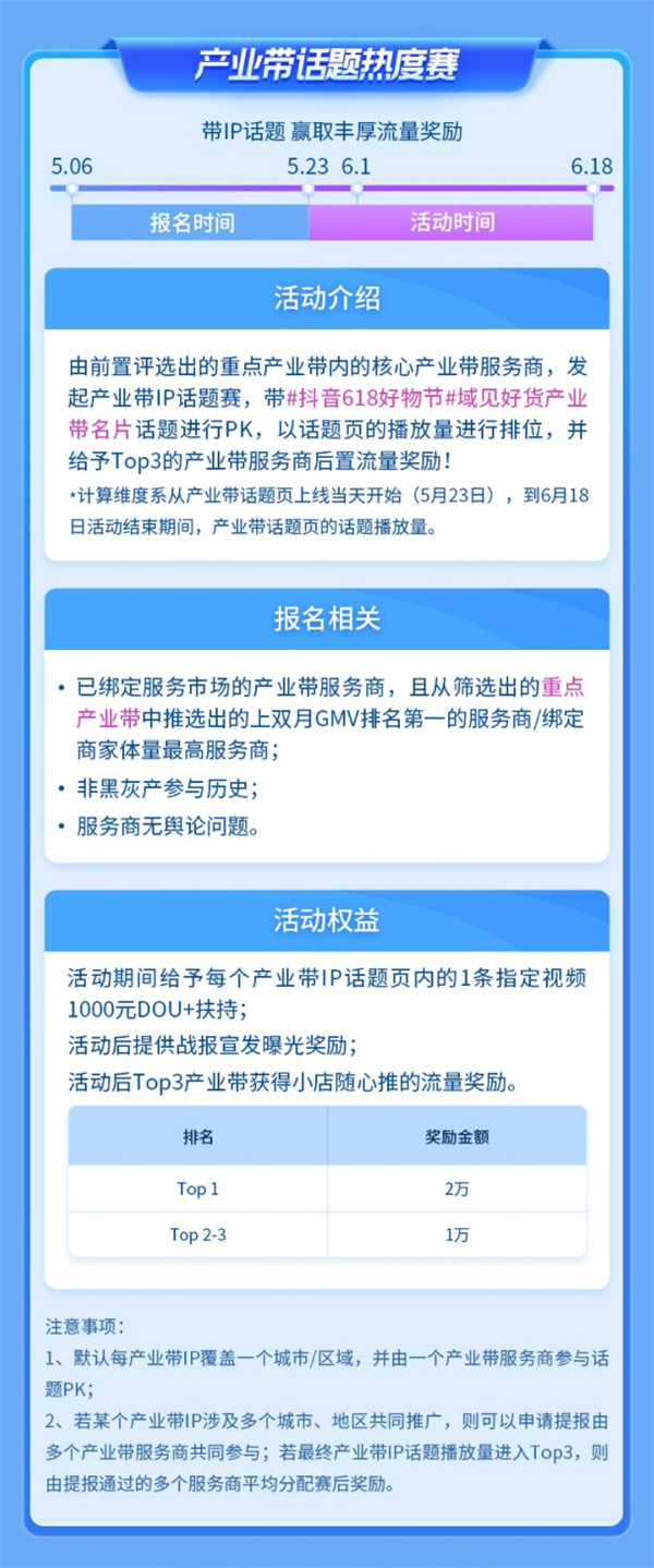 由前置評(píng)選出的重點(diǎn)產(chǎn)業(yè)帶內(nèi)的核心產(chǎn)業(yè)帶服務(wù)商,發(fā)起產(chǎn)業(yè)帶IP話題賽。帶#抖音618好物節(jié) #域見好貨產(chǎn)業(yè)帶名片 話題進(jìn)行PK,且話題頁播放量排在Top3的產(chǎn)業(yè)帶服務(wù)商,都將獲得后置流量獎(jiǎng)勵(lì)。