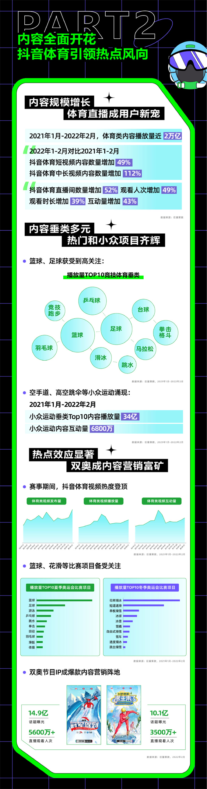 《白皮書》顯示,2022年1-2月對比2021年1-2月,抖音體育類內(nèi)容播放量共計約2萬億次,分布在各類賽事、競技運動、健身等行業(yè)。