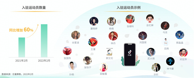 除參賽運動員外,張怡寧、郭晶晶等退役運動員也在抖音活躍起來,以此作為與大眾溝通的渠道。2022年2月對比2021年2月,職業(yè)運動員入駐數(shù)增加60%