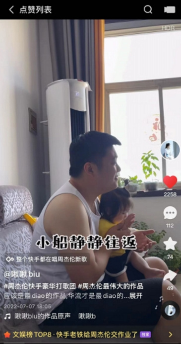 各路民間大神交給杰倫的作業(yè)同樣別具風格?!班编眀iu”(快手ID:2677455624)雖已是奶爸,但聽到旋律后便把帶娃時刻變成追星現場,帶著一臉懵的寶寶一起打起了節(jié)拍。培養(yǎng)杰迷就是要從娃娃抓起。