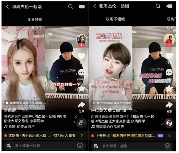于是,這條伴奏短視頻發(fā)布之后, @拉美天后Camila、@王錘錘(王依丹)、@桑娜_、@夏花·銀火火、@秋陌Cheyenne、@陳誠好帥啊等快手音樂達人第一時間紛紛響應,和周杰倫合拍視頻一展歌喉,并將自己的風格融入《最偉大的作品》,產出了五花八門的二創(chuàng)內容,不僅有男生女生版,還有rap版、甚至西班牙語和英文版。其中@王錘錘(王依丹)一人用四種聲音“和周杰倫一起唱”,@桑娜_的合唱融入了更多的感情;@拉美天后Camila創(chuàng)意性的用西班牙語演繹了一番,賦予《最偉大的作品》別樣的聽覺感受。