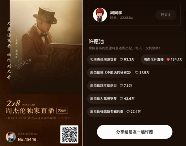 7月6日,隨著周杰倫先行曲《最偉大的作品》MV全網(wǎng)發(fā)布,快手也在站內(nèi)同一時(shí)間開放了“許愿池”活動(dòng),票數(shù)最高的愿望將直達(dá)周杰倫,活動(dòng)開啟后無(wú)數(shù)粉絲前來(lái)許愿,“和周杰倫周游世界”、“周杰倫為我彈鋼琴”、“周杰倫拍《不能說(shuō)的秘密2》”等成為了粉絲們最想實(shí)現(xiàn)的熱門愿望。而“周杰倫開直播”的許愿更是在短時(shí)間內(nèi)得到了超過(guò)130萬(wàn)的點(diǎn)贊。于是快手官方在7月10日中午12點(diǎn)正式回應(yīng)網(wǎng)友許愿,正式官宣了周杰倫將于7月18號(hào)19:00獨(dú)家直播的消息,不少粉絲慨嘆,“原來(lái)在快手許愿,真的能實(shí)現(xiàn)愿望?!爆F(xiàn)在上快手搜索“周杰倫”就可以一鍵預(yù)約直播,并生成帶有隨機(jī)歌詞的專屬編號(hào)海報(bào),儀式感拉滿,每一位杰迷都能擁有周杰倫的專屬編號(hào)。目前距離直播還有一周的時(shí)間,預(yù)約人數(shù)已經(jīng)突破百萬(wàn)。據(jù)透露,預(yù)約人數(shù)突破200萬(wàn),將解鎖神秘直播嘉賓。