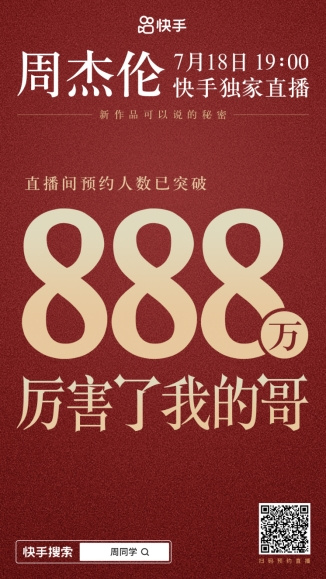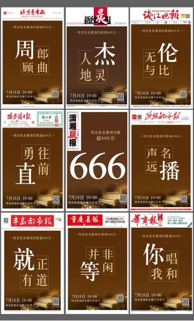 周杰倫的快手直播預(yù)約人數(shù)從666萬(wàn)到888萬(wàn),僅僅用了一天的時(shí)間,周杰倫本人的快手賬號(hào)@周同學(xué),粉絲數(shù)也已超4000萬(wàn)。在預(yù)約人數(shù)超666萬(wàn)后,更有北京青年報(bào)、新聞晨報(bào)、半島都市報(bào)等九大報(bào)紙用“成語(yǔ)的方式打開(kāi)周杰倫”,為其直播應(yīng)援打call?!啊钢堋估深櫱薄ⅰ叭恕附堋沟仂`”、“無(wú)與「?jìng)悺贡取?、“勇往「直」前”、“聲名遠(yuǎn)「播」”、“「就」正有道”、“并非「等」閑”、“「你」唱我和”,幾個(gè)醒目的大字連在一起就是“周杰倫直播就等你”和“周杰倫直播預(yù)約數(shù)超666萬(wàn)”。當(dāng)四字成語(yǔ)的文化底蘊(yùn)與周杰倫《最偉大的作品》碰撞在一起,呈現(xiàn)出流行文化和傳統(tǒng)文化的跨界魅力。不愧是華語(yǔ)樂(lè)壇流量天花板,這個(gè)排面也太足了!