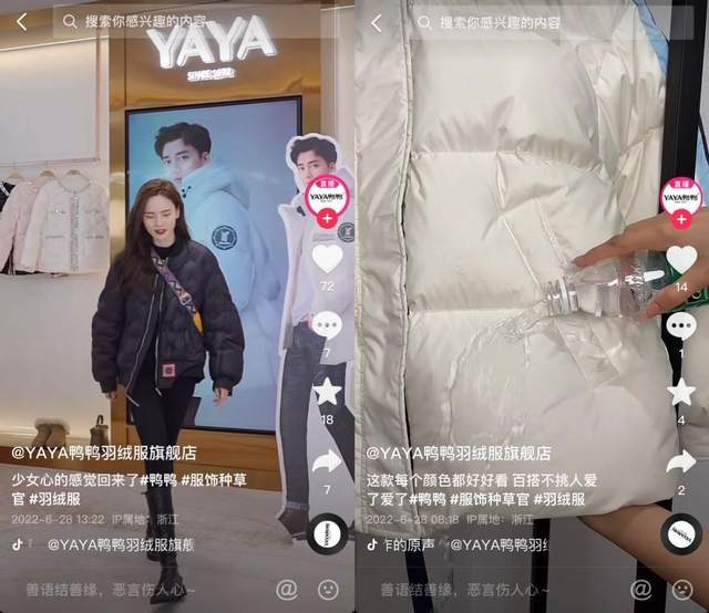 例如,當(dāng)主播在介紹一款鴨鴨女士輕薄羽絨服,會(huì)強(qiáng)調(diào)這款羽絨服精選90鴨絨,同時(shí)還詳細(xì)介紹了這款羽絨服所使用的分割充絨技術(shù),有效防止鉆絨。同時(shí),鴨鴨在直播或者短視頻中還會(huì)“現(xiàn)身說法”,通過直接往衣服上倒水等方式證明羽絨服的品質(zhì)。
