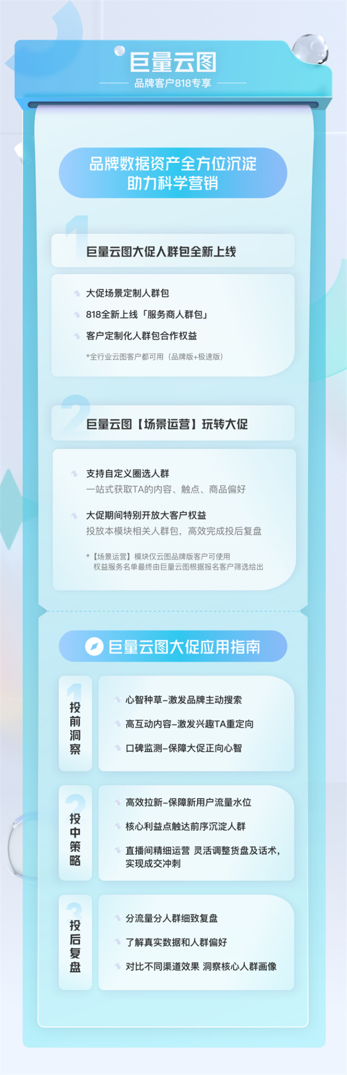 巨量云圖還推出大促應(yīng)用指南,指引品牌和服務(wù)商有針對性地進(jìn)行投前洞察、投中策略和投后復(fù)盤,逐層深入促進(jìn)人群流轉(zhuǎn),在實(shí)現(xiàn)成交沖刺的同時,也帶動品牌資產(chǎn)的沉淀。
