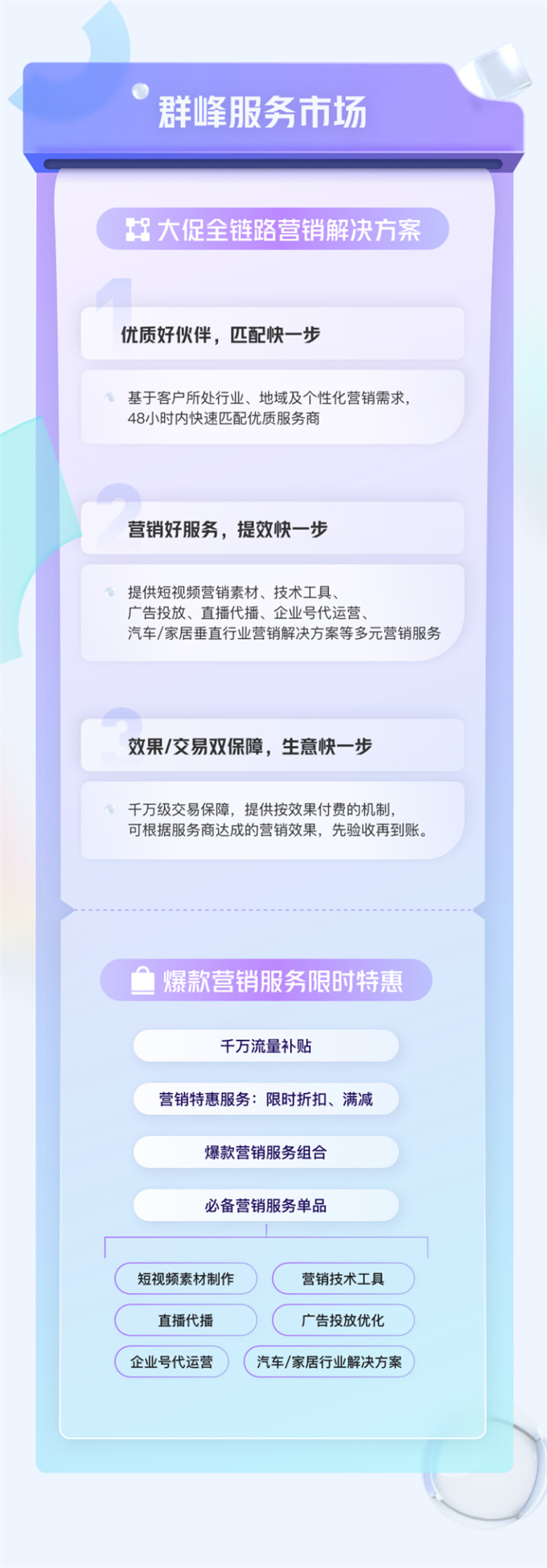 為促進(jìn)品牌與服務(wù)商之間的高效對接,群峰服務(wù)市場推出大促全鏈路營銷解決方案,基于品牌商家特質(zhì)匹配優(yōu)質(zhì)服務(wù)商,提供廣告投放優(yōu)化、直播代播、企業(yè)號代運(yùn)營等多元服務(wù),且通過“先驗(yàn)收再到賬”的機(jī)制提供交易保障。