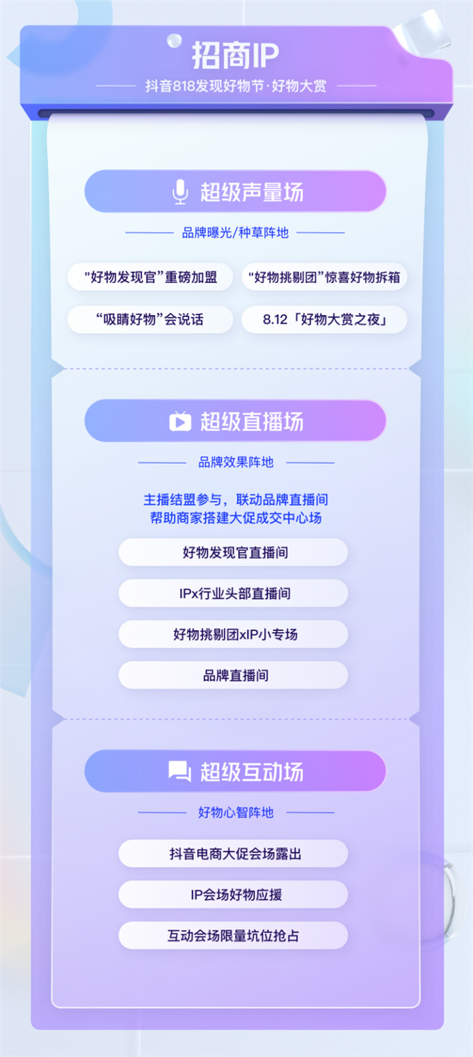 巨量引擎×抖音電商推出抖音818發(fā)現(xiàn)好物節(jié)·好物大賞,打造一年一度的好物大事件。超級聲量場、超級直播場、超級互動場,三“場”聯(lián)動,形成大促營銷矩陣,在“好物發(fā)現(xiàn)官”、“好物挑剔官”擴(kuò)大種草范圍的基礎(chǔ)上,以直播間承接種草效果,結(jié)合互動玩法實(shí)現(xiàn)引流轉(zhuǎn)化;更有流量明星、人氣笑將、高粉達(dá)人、行業(yè)超頭主播結(jié)盟,強(qiáng)力提升大促活動關(guān)注度。