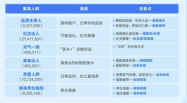 白大師借助巨量云圖根據(jù)人群特性與內(nèi)容偏好等聚類(lèi)破圈人群,并分別產(chǎn)出內(nèi)容創(chuàng)意和場(chǎng)景創(chuàng)意,例如針對(duì)品質(zhì)生意人主打商務(wù)送禮,針對(duì)精準(zhǔn)養(yǎng)生媽媽主打保健養(yǎng)顏等,最終實(shí)現(xiàn)破圈拉新。