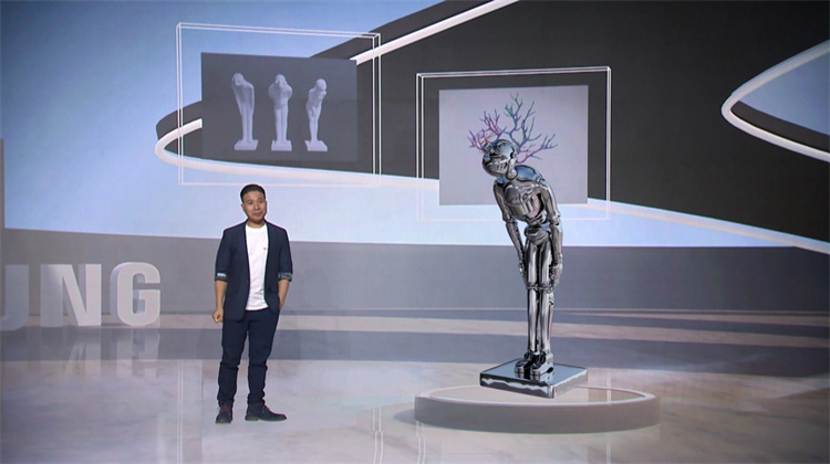 未來感的畫作展館,琳瑯滿目的匠心作品,雕塑家高孝午以折疊靈感,現(xiàn)場(chǎng)揭幕《未來標(biāo)準(zhǔn)》作品的亮相;