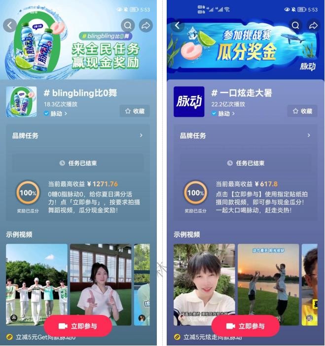 將節(jié)目?jī)?nèi)容效果延續(xù)甚至放大至年輕人聚集的社交平臺(tái),《全力以赴的行動(dòng)派》播出期間,脈動(dòng)借力節(jié)目熱度和挑戰(zhàn)玩法,在抖音陸續(xù)發(fā)起#blingbling比0舞#、#一口炫走大暑#、#解鎖城市新玩法#三大話題挑戰(zhàn)賽,邀請(qǐng)抖音用戶拍同款、剪同款,點(diǎn)燃了抖音用戶的創(chuàng)作欲,更進(jìn)一步帶來(lái)了UCG互動(dòng),放大了綜藝營(yíng)銷的價(jià)值。