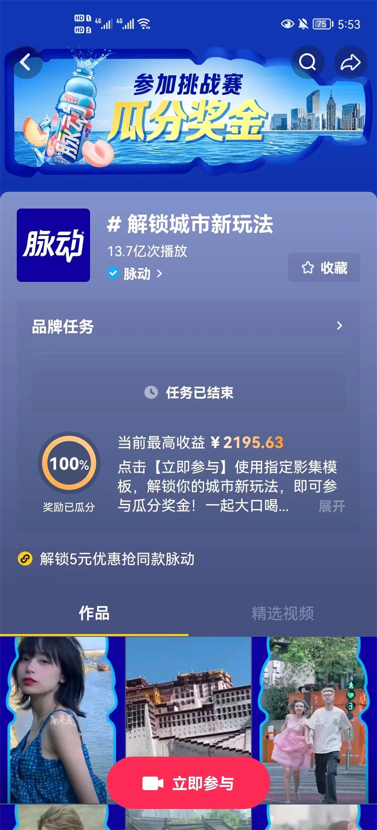 其中,#解鎖城市新玩法#與《全力以赴的行動(dòng)派》立意高度契合,邀請(qǐng)達(dá)人們?cè)谌粘I畹某鞘兄袑ふ揖?,再用脈動(dòng)指定模板剪出同款視頻,通過(guò)與用戶的雙向互動(dòng),升華品牌的形象塑造。在三里distant、唐豆子、小星狗等優(yōu)質(zhì)視頻創(chuàng)作網(wǎng)紅的帶動(dòng)下,各地網(wǎng)友也接連發(fā)布相關(guān)短視頻,自來(lái)水的涌入大大增強(qiáng)了話題的關(guān)注度,脈動(dòng)獨(dú)特的瓶身設(shè)計(jì)、脈動(dòng)x抖音原創(chuàng)歌曲《桃桃心動(dòng)》也隨之被用戶所熟知。截至挑戰(zhàn)賽結(jié)束,#解鎖城市新玩法#累計(jì)收獲13.7億次的播放量,#一口炫走大暑#收獲22.2億次播放,#blingbling比0舞#收獲18.3億次播放,脈動(dòng)也得以實(shí)現(xiàn)大規(guī)模的曝光,自然而然也就助力了銷售的轉(zhuǎn)化。