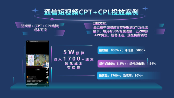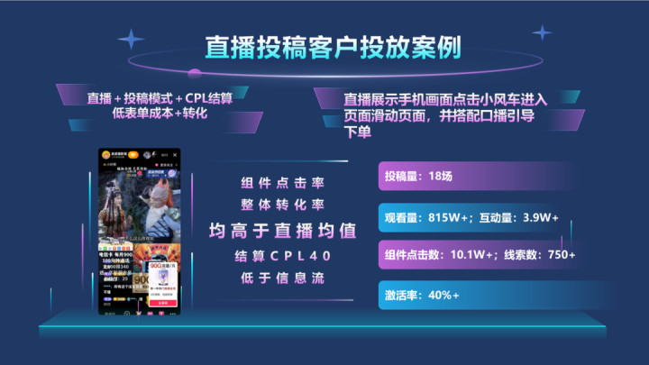 在直播場景下,巨量星圖與通信行業(yè)共創(chuàng)以CPL(線索成本)結算的直播投稿模式,以提升整體轉化效果。通信客戶可以通過巨量星圖合作不同的垂類達人,解決達人合作難的問題;同時,直播中的手機畫面展示、小風車掛件,搭配口播引導下單等方式,也為通信客戶打通了從“看直播”到“激活卡”的順滑轉化鏈路。此次項目共進行了18場,引入750+線索,號卡激活率40%,轉化成本低于競價。