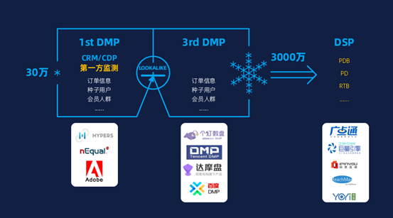 如上圖,企業(yè)第一方數(shù)據(jù)相當(dāng)于精準(zhǔn)的Y值,DMP服務(wù)方則是擁有海量的X值。當(dāng)一個(gè)品牌根據(jù)其第一方數(shù)據(jù)鎖定目標(biāo)人群后,品牌主就能依托DMP服務(wù)方的海量數(shù)據(jù)基礎(chǔ),利用look-alike算法進(jìn)行人群擴(kuò)量,從而找到更多的潛在目標(biāo)人群。例如,今年5月我們就幫助某歐洲品牌奶粉,將其30萬(wàn)會(huì)員進(jìn)行相似人群擴(kuò)量,最終找到了3000萬(wàn)的目標(biāo)人群,從而在確保觸達(dá)精準(zhǔn)用戶的前提下,助力品牌影響更多的潛在目標(biāo)人群讓品牌“營(yíng)銷(xiāo)”釋放更大的能量。