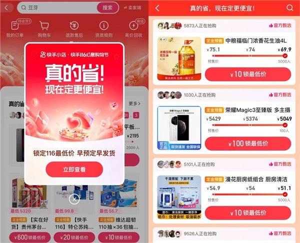 “真的省”補(bǔ)貼專區(qū)是本次116大促核心補(bǔ)貼欄目??焓止俜綄?duì)用戶需求集中的大牌數(shù)碼家電、美妝,以及食品生鮮、日用百貨和農(nóng)用物資等民生剛需類商品進(jìn)行高額補(bǔ)貼。在“真的省”專區(qū),可以看到這些價(jià)格很有競(jìng)爭(zhēng)力的商品包括花生油、各品牌手機(jī)、電腦、零食、酒水等等,每款商品滿足幾十人到幾千人下單不等的條件,就能獲得超低價(jià)。按照活動(dòng)進(jìn)程,快手用戶在10月13日至19日間預(yù)付定金,20日至24日開始支付尾款。同時(shí),10月24日至11月11日的每晚8至11點(diǎn),快手官方還將放出高折扣福利品限額限時(shí)秒殺。
