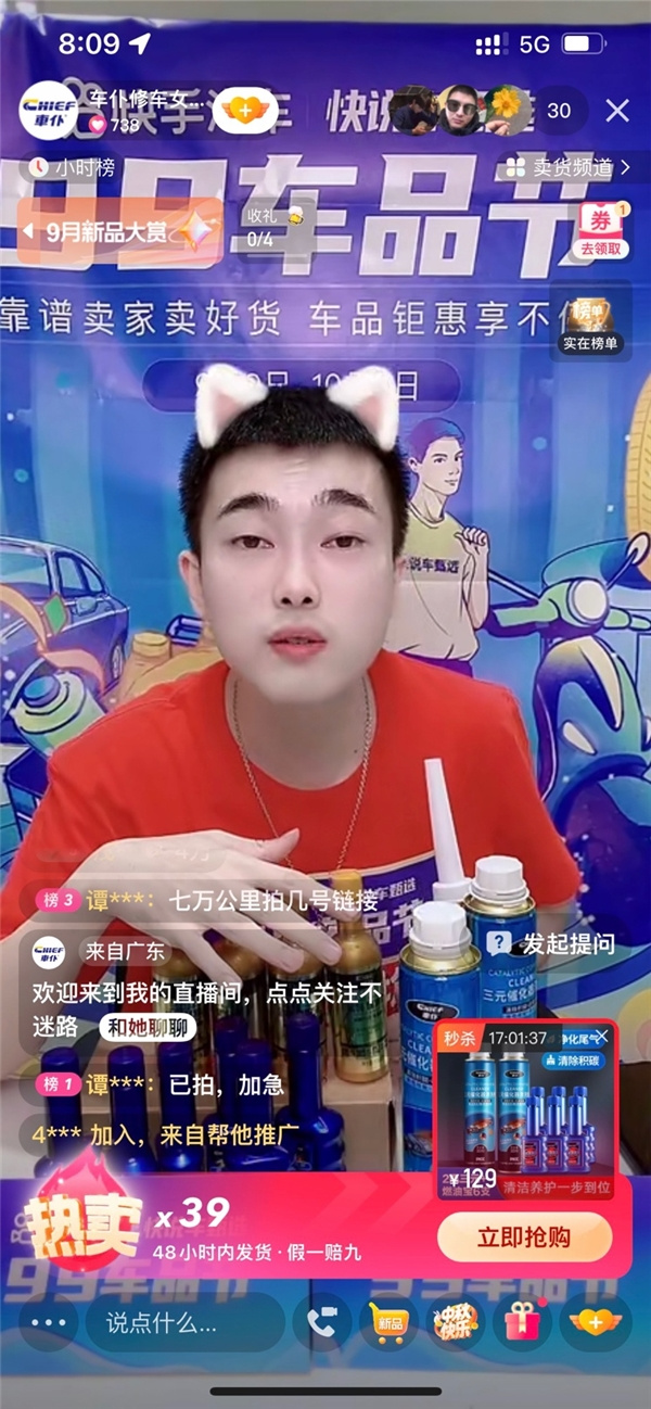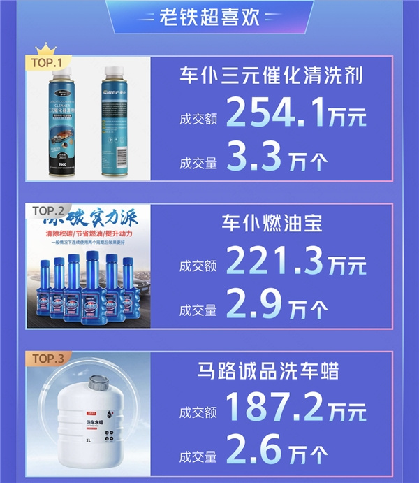 在甄選優(yōu)質(zhì)創(chuàng)作者、多元玩法創(chuàng)新、官方扶持等多種舉措下,“快說車甄選·99車品節(jié)”效果顯著。從整體數(shù)據(jù)來看,截至目前,#快說車甄選# 話題下累計7578個作品,共獲得1.6億+曝光,#99車品節(jié)# 話題下2069個作品曝光量達5900萬+;“99車品節(jié)”相關(guān)內(nèi)容曝光更是破億,總成交額同比增長94.7%,總訂單量同比增長103.6%,買家分布基本覆蓋所有區(qū)縣;從互動效果來看,開播場次同比增長23.1%,觀看次數(shù)同比增長62.7%;從商家增量來看,賣家數(shù)量同比增長31.5%,成交額同比增長100%的賣家數(shù)近4000,成交額破百萬商家同比增長65.0%,成交額破百萬單品同比增長28.6%;從最終成交商品來看,最受用戶喜歡的養(yǎng)護維修單品是車仆三元催化清洗劑,成交量超3.3萬個,成交額達254萬元;其次為車仆燃油寶,成交量2.9萬個,成交額220余萬元;緊隨其后的是馬路誠品洗車蠟,成交量超2.6萬個,成交額達187萬元。