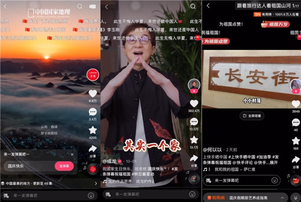 而快手在國(guó)慶期間推出的彈幕活動(dòng)則吸引了四川觀察、環(huán)球網(wǎng)等20個(gè)媒體號(hào)以及成龍、朗朗、蔡明、謝娜等21位明星,旅游、攝影、情感、二次元、舞蹈、顏值、音樂等垂類66個(gè)大V共同參與。在@中國(guó)地理景觀 發(fā)布的《中國(guó)人的家園》短視頻中,各地美景共同拼出一幅祖國(guó)的錦繡山河圖,多地用戶以“報(bào)地名”的方式,紛紛發(fā)送帶有小紅旗的彈幕表白祖國(guó);@成龍 發(fā)布的翻唱歌曲《國(guó)家》短視頻中,刷屏的彈幕“此生無悔入華夏,來生還做中國(guó)人”則展現(xiàn)了家國(guó)情懷;旅行達(dá)人@何以以 的視頻里,用戶一道“云”看天安門廣場(chǎng),以“祖國(guó)萬歲”“為祖國(guó)點(diǎn)贊”的特殊彈幕表達(dá)出心中的自豪和熱愛。
