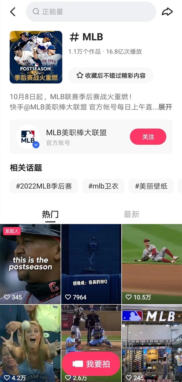 在棒球運動方面,MLB官方在2020初便入駐快手,通過賬號@MLB美職棒大聯(lián)盟 持續(xù)發(fā)布賽事相關(guān)內(nèi)容、進行棒球運動科普,并基于#MLB、#第一堂棒球課等多個線上話題與快手用戶展開互動,讓更多泛體育領(lǐng)域的人群能夠參與進來,感受棒球運動的魅力。目前,快手平臺上#MLB 話題相關(guān)短視頻播放量已超過16.7億次,此次和MLB的合作,也是快手持續(xù)發(fā)力國際化體育內(nèi)容布局的又一重要動作。