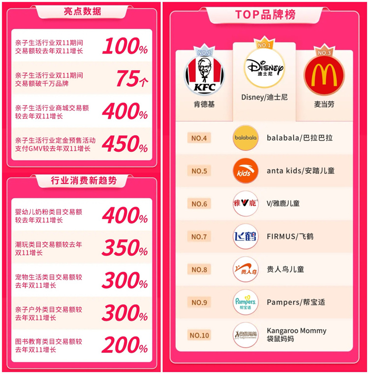 根據(jù)數(shù)據(jù)顯示,在今年雙11期間,抖音電商親子生活行業(yè)交易額較去年同期增加100%。定金預(yù)售活動支付GMV較去年同期增長450%,超過75個品牌交易額突破千萬大關(guān)。其中嬰幼兒奶粉類目交易數(shù)據(jù)尤為搶眼,成交額較去年同期增長400%。其次潮玩類目、寵物生活類目、親子戶外類目的交易數(shù)據(jù)也均超出預(yù)期較去年同期增長300%以上。