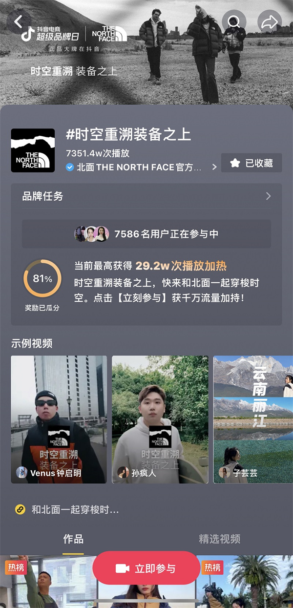 活動(dòng)前期,抖音電商超級(jí)品牌日聯(lián)動(dòng)北面The North Face共同策劃推出了品牌種草話題#時(shí)空重溯裝備之上 及沖榜熱點(diǎn)話題#穿越山海冬日氛圍變裝,為聯(lián)名款新品「TIME TRAVEL」時(shí)空重溯別注限定系列充分預(yù)熱造勢(shì)。