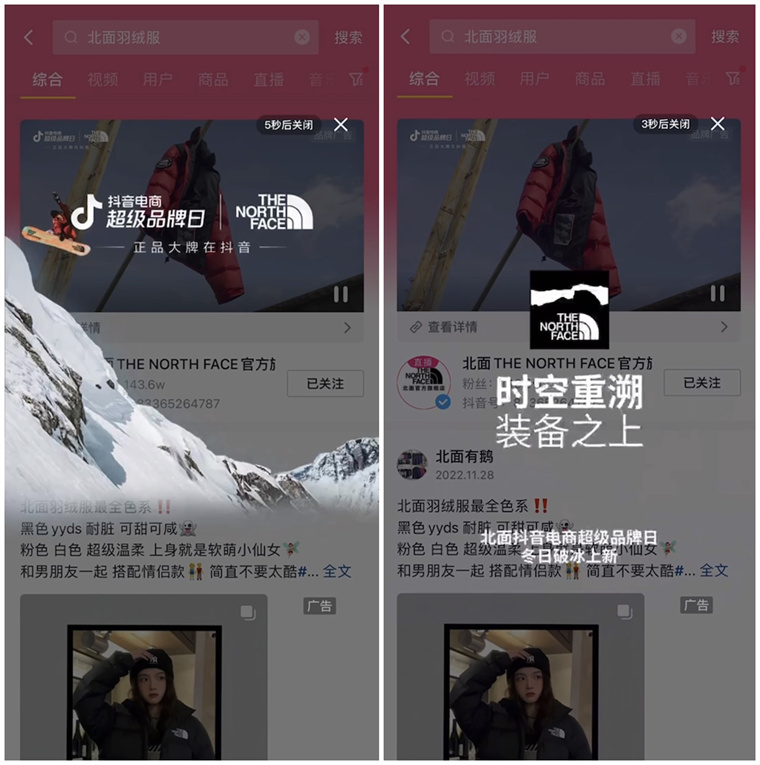 除以優(yōu)質(zhì)內(nèi)容連接、拓展消費(fèi)者之外,在本次活動(dòng)中,抖音電商超級(jí)品牌日助推北面The North Face 發(fā)力搜索運(yùn)營(yíng),承接用戶興趣衍生出來(lái)的消費(fèi)需求。活動(dòng)中采取了搜索結(jié)果干預(yù)策略,當(dāng)用戶在抖音搜索品牌關(guān)鍵詞之后,界面即刻會(huì)彈出本次合作款新品的特效彩蛋,給用戶的搜索行為帶來(lái)新鮮的驚喜感之時(shí),也有力提升了其對(duì)品牌的好感。增加合作款新品「TIME TRAVEL」時(shí)空重溯別注限定系列在抖音電商平臺(tái)的曝光,引導(dǎo)消費(fèi)者深入了解品牌及產(chǎn)品詳情,助推銷售轉(zhuǎn)化。