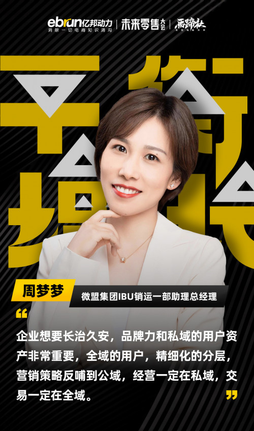 【億邦原創(chuàng)】12月15日消息,在平衡增長·2023億邦未來零售大會(huì)上,微盟集團(tuán)智慧商業(yè)事業(yè)群IBU銷運(yùn)一部助理總經(jīng)理周夢(mèng)夢(mèng)發(fā)表了題為《零售企業(yè)數(shù)智升級(jí),全域經(jīng)營驅(qū)動(dòng)價(jià)值增長》的演講。她指出,目前企業(yè)正在面對(duì)公域私域的選擇和平衡,面對(duì)這樣的選擇與平衡,企業(yè)應(yīng)“私域經(jīng)營、全域交易”,并長期堅(jiān)持構(gòu)建全域增長的模型。