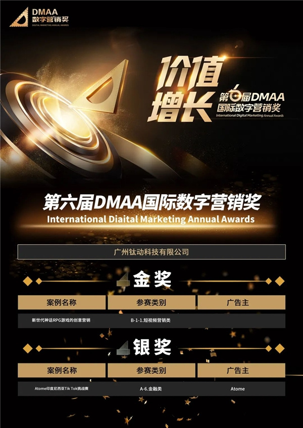 鈦動科技作為出海領域的領先者,此次也向主辦方申報了2個案例,并順利“摘金奪銀”,一舉斬獲第六屆DMAA國際數字營銷獎【金獎】及【銀獎】兩大獎項!