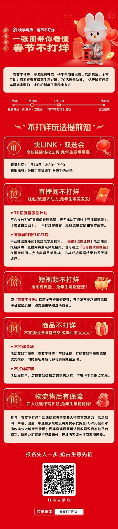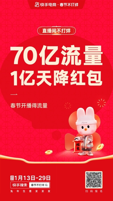 隨著兔年春節(jié)臨近,全國消費(fèi)市場持續(xù)升溫。為了幫助商家抓住春節(jié)消費(fèi)旺季契機(jī),快手電商宣布于1月13日-29日推出“春節(jié)不打烊”活動,將通過快LINK·雙選會、直播間不打烊、短視頻不打烊、商品不打烊、物流售后有保障五大活動全方位助力商家在春節(jié)假期生意爆發(fā)。