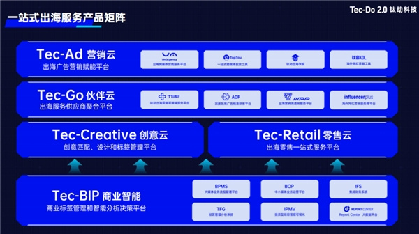 鈦動(dòng)科技打造了Tec-Ad營(yíng)銷(xiāo)云、Tec-Go伙伴云、Tec-Creative創(chuàng)意云、Tec-Retail零售云、Tec-BIP商業(yè)智能一站式出海產(chǎn)品矩陣,提供強(qiáng)大的技術(shù)保障和產(chǎn)品賦能廣告主出海營(yíng)銷(xiāo),使?fàn)I銷(xiāo)應(yīng)用和場(chǎng)景更加技術(shù)化和產(chǎn)品化,加速?gòu)V告主數(shù)字化轉(zhuǎn)型,提升廣告主在海外市場(chǎng)的競(jìng)爭(zhēng)優(yōu)勢(shì)。