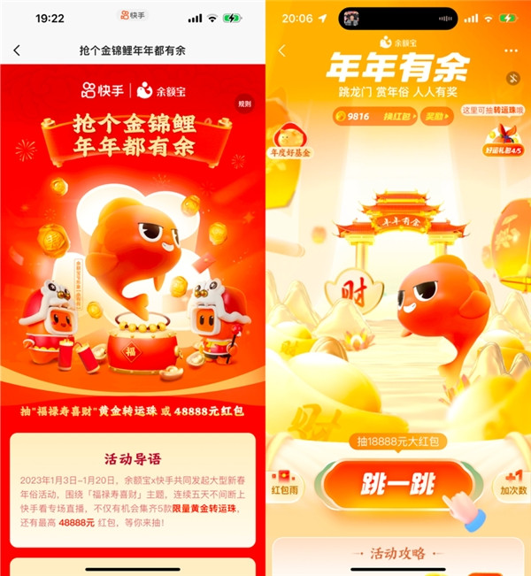 而余額寶平臺(tái)也同步推出“躍龍門”互動(dòng)游戲,呼應(yīng)“年年有余”主題。兩大平臺(tái)聯(lián)手發(fā)力,直擊用戶對(duì)新年的美好期許心理,從而激發(fā)大眾雙平臺(tái)參與熱情,在玩游戲、賞年俗、猜答題之余也能收獲搶錦鯉的快樂。