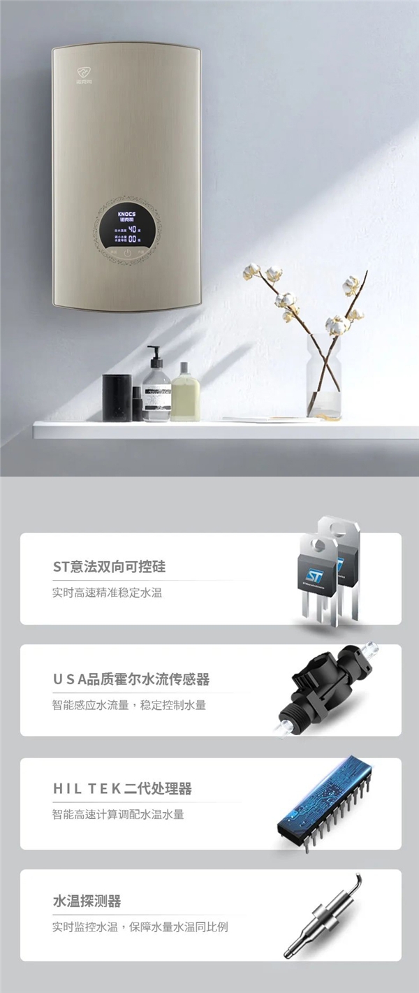 并且,為了保證水溫的穩(wěn)定性,諾克司瀑布洗即熱式電熱水器DST-F-E2還采用了業(yè)內(nèi)領(lǐng)先的雙ST可控硅,全自動(dòng)恒溫調(diào)節(jié)。靠近進(jìn)水口和出水口,搭配高精度水溫探測器,實(shí)時(shí)監(jiān)控水溫,保障水量水溫同比例,實(shí)現(xiàn)精準(zhǔn)控溫,讓人們能夠擁有一個(gè)穩(wěn)定、舒適的洗浴過程。