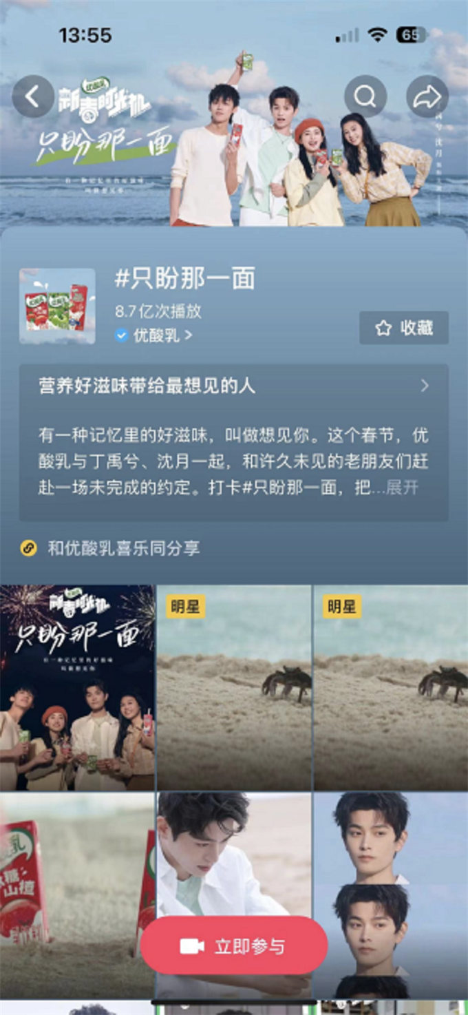 在心智種草層面,優(yōu)酸乳基于抖音陣地,結(jié)合多平臺傳播完成差異化溝通。在抖音平臺,優(yōu)酸乳掀起沉浸式社交新體驗,主話題#新春時光機 總瀏覽量達到131億+,50+明星藝人、抖音創(chuàng)作者拜年造勢,送出新春祝福。