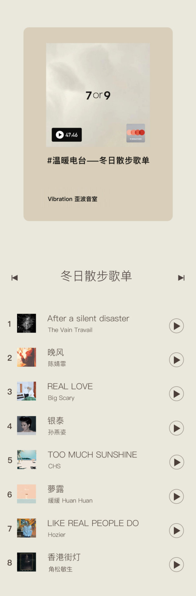 對溫暖的感知是多維度的,7or9在內(nèi)容上也做出更多嘗試,結(jié)合2022年感恩節(jié)節(jié)點,與治愈系播客Vibration歪波音室聯(lián)合企劃《冬日散步》電臺節(jié)目,節(jié)目以7or9被窩暖暖靴冬日散步的場景為靈感,加入主播推薦的冬日散步歌單以及原創(chuàng)詩,用聽的方式,傳遞節(jié)日不一樣的溫度。
