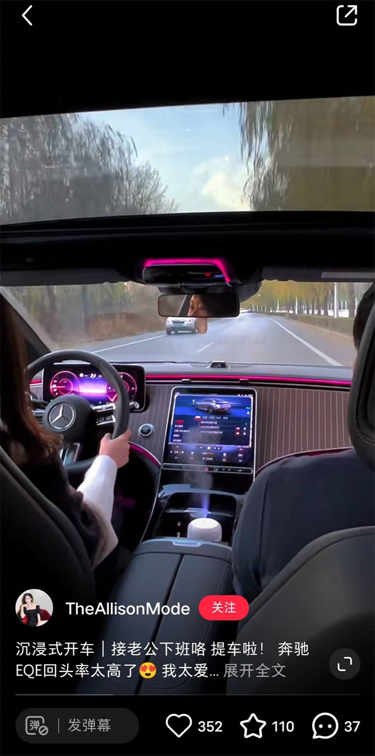 @TheAllisonMode分享了沉浸式開車接老公下班的vlog。開著心愛的奔馳EQE,副駕坐著老公,車上放著音樂,再配上EQE的氛圍燈,誰能拒絕這樣的幸福生活?