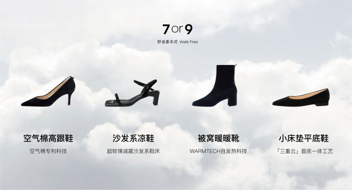 將舒適科技產(chǎn)品貫穿于女性每個出行日常,滿足女生們在不同場景下的舒適需求,就是7or9所提出的“舒適基本式”,在品類維度,從顛覆傳統(tǒng)認知打造空氣棉高跟鞋的破圈之旅,到洞悉女性日常更多場景需求,拓展被窩暖暖靴、沙發(fā)系涼鞋、到小床墊平底鞋打造全方位的舒適需求,并且堅持每一年舒適升級;在科技與工藝維度,把舒適體驗感做到極致化,在鞋子中植入運動界、內(nèi)衣界、美容界等行業(yè)尖端科技工藝,在行業(yè)中不斷夯實舒適女鞋品牌的標桿性地位,讓更多人看到7or9始終致力于解決當下市場中幾乎只強調(diào)“外在審美”帶來的品類局限問題,給女性更多舒適自由的選擇。