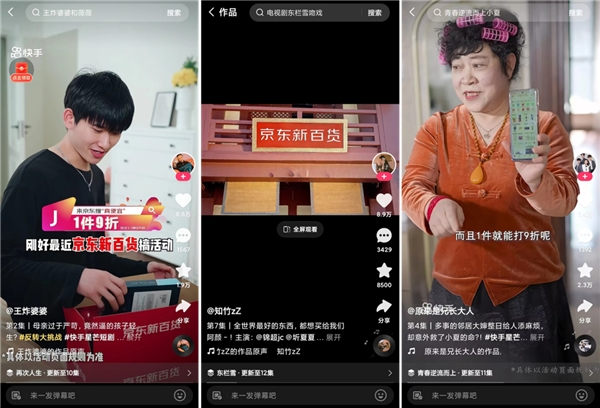 巨大的短劇消費空間,暗藏著品牌夢寐以求的商機。在京東新百貨3.8節(jié)活動中,快手就為其打造了定制品牌專屬劇場、包段劇情植入、節(jié)點流量助推、主創(chuàng)直播推廣等短劇營銷組合玩法,助力前者高頻觸達精準受眾、立體滲透用戶心智。