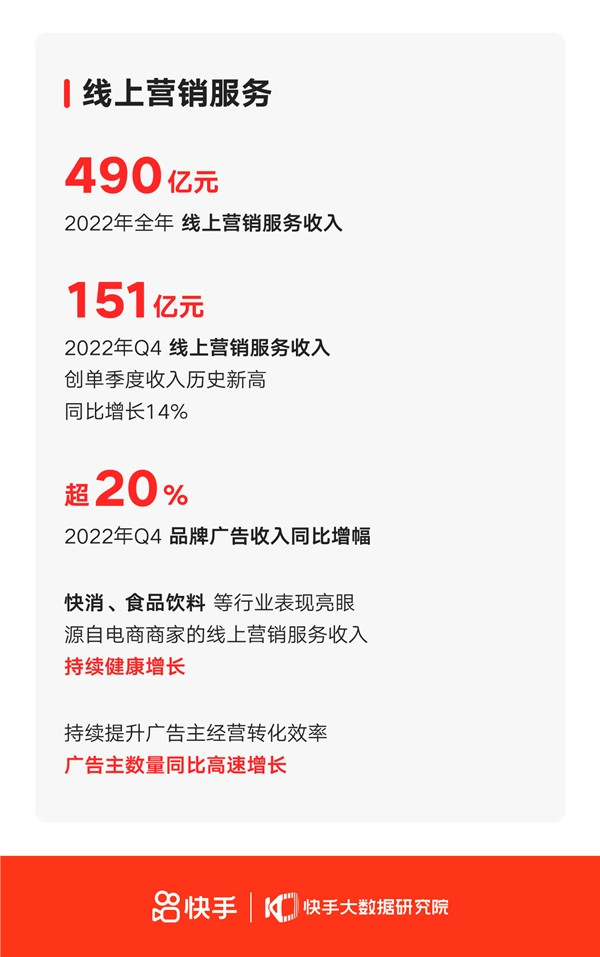 當(dāng)天晚間舉行的業(yè)績電話會上,快手CEO程一笑透露,伴隨著宏觀經(jīng)濟(jì)逐步復(fù)蘇,以及四季度電商大促等營銷活動的拉動,平臺上電商商家貢獻(xiàn)的線上營銷服務(wù)收入持續(xù)健康增長,其中快消、食品飲料等行業(yè)表現(xiàn)突出。通過短視頻和直播的雙開策略,提高廣告主轉(zhuǎn)化效果,短視頻廣告收入占比也持續(xù)提升。品牌廣告方面,借助重要營銷節(jié)點(diǎn)和自建招商項(xiàng)目,以及品牌相關(guān)產(chǎn)品能力的迭代,Q4品牌廣告收入同比增長超20%。