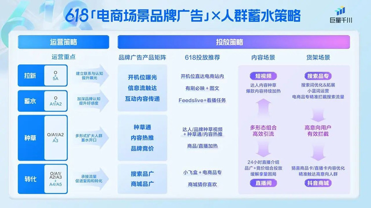 當(dāng)下正是人群蓄水的黃金節(jié)點,巨量千川也為商家推出“人群蓄水策略”,一圖了解不同階段產(chǎn)品應(yīng)用組合。