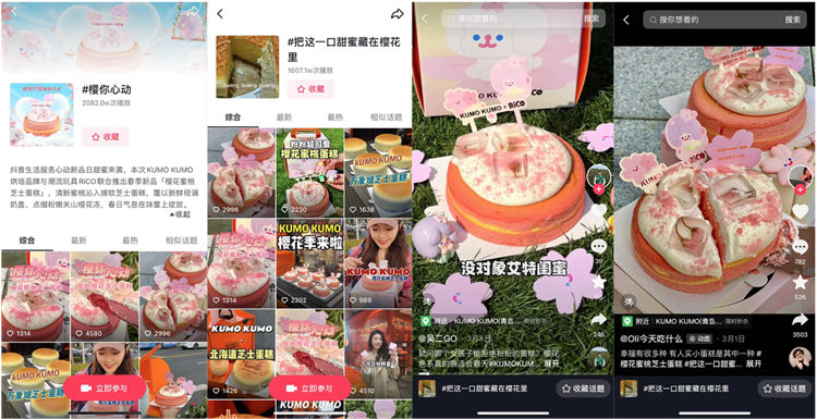 本次KUMO KUMO與潮玩品牌RiCO共同在抖音生活服務(wù)「心動(dòng)上新日」推出聯(lián)名新品“櫻花蜜桃芝士蛋糕”上線,僅兩周GMV突破350萬(wàn),連破GMV新高?;顒?dòng)內(nèi)策劃話題曝光量突破1800萬(wàn),共有2000+條達(dá)人短視頻探店,短視頻曝光超過(guò)2700萬(wàn)。