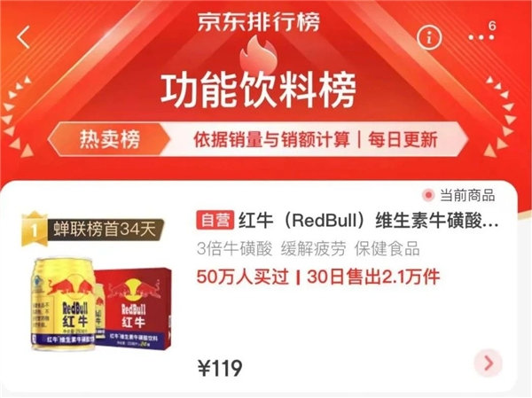 在渠道上,紅牛?維生素?;撬犸嬃仙罡€上線下渠道,建立了完善的渠道矩陣。在線上渠道,紅牛?維生素牛磺酸飲料一上市便迅速獲得消費(fèi)者喜愛,目前已經(jīng)成為電商渠道“功能飲料熱賣榜”第一的產(chǎn)品。