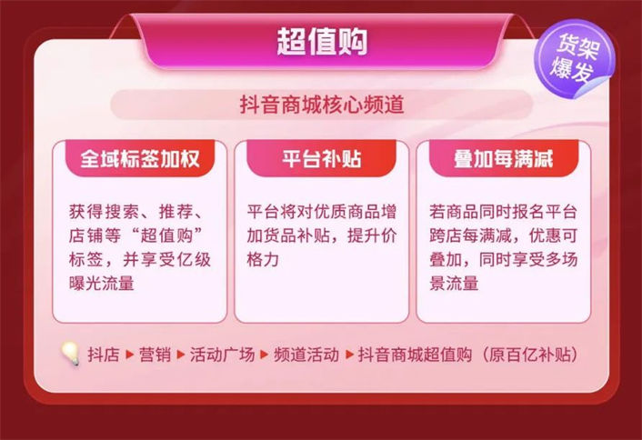 貨架場景近來是抖音電商大促營銷的重頭戲,抖音618好物節(jié)將通過一系列組合玩法,幫助商家打通“人找貨”鏈路,打造生意增長新引擎。作為抖音商城核心頻道,「超值購」將通過全域標簽、平臺補貼,疊加每滿減等權益,幫助商家鎖定商城流量,讓更多精選大牌、優(yōu)價尖貨在大促好物浪潮中脫穎而出;「搜索激勵賽」將鼓勵商家發(fā)布短視頻、使用搜索錨點工具,平臺將根據(jù)短視頻交易量給予巨量千川獎勵,幫助商家實現(xiàn)短視頻流量與訂單的雙豐收。