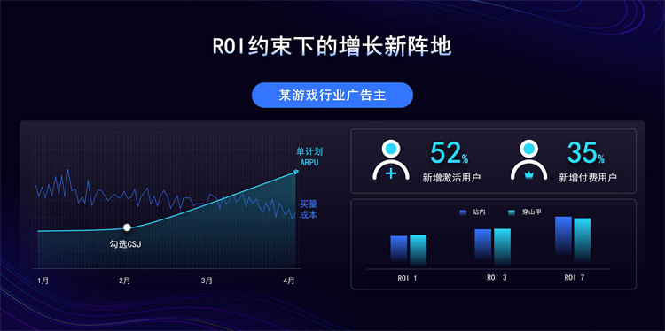穿山甲的廣告產(chǎn)品負責人在大會上分享了一個案例:某游戲客戶曾經(jīng)把流量主場錨定在抖音,但在今年2月出現(xiàn)了明顯的買量瓶頸。為了尋求破局,客戶開始在穿山甲平臺嘗試通投。為了不影響客戶的整體投放計劃,穿山甲團隊繼續(xù)用抖音的首日ROI來控制穿山甲上的投放節(jié)奏,并參考抖音站內(nèi)的轉(zhuǎn)化樣本持續(xù)對投放進行優(yōu)化。結(jié)果是,客戶居然在買量成本下降的同時,實現(xiàn)了52%的新增激活用戶和35%的新增付費用戶。