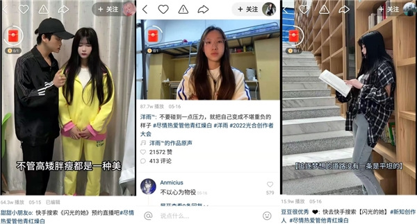 直播之外,快手還打造了#盡情熱愛管他青紅燥白 話題頁(yè),聯(lián)合眾多快手達(dá)人共創(chuàng)短視頻內(nèi)容,分享女性價(jià)值新主張,并為直播活動(dòng)積累熱度。例如,@洋雨呼吁女孩們“不要碰到一點(diǎn)壓力,就把自己變成不堪重負(fù)的樣子,也不要碰到一點(diǎn)不確定性,就覺得自己前途黯淡無光,熬過去、跨過去,好運(yùn)自然會(huì)來到”;@甜甜小朋友o拒絕身材焦慮,表示“世界因不同的美而豐富多彩,不管高矮胖瘦都是一種美”。
