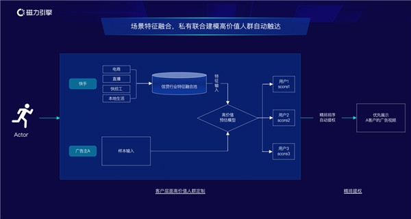 私有聯(lián)合建模的高價值人群挖掘和自動提權(quán),提升客戶高價值人群觸達。磁力引擎充分考慮到快手站內(nèi)多場景用戶特征融合,從而進行私有聯(lián)合建模高價值人群自動觸達。