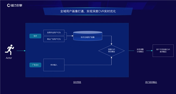 具體來說:第一步,將快手「用戶端自然作品的用戶行為」和「商業(yè)端轉(zhuǎn)化行為的用戶」做畫像融合,充分構(gòu)建快手全域的用戶畫像,構(gòu)建實時深度CVR預(yù)估模型;第二步,對每次廣告請求背后的用戶意圖做判斷,實時對廣告排序加減價,對用戶差異觸達,實現(xiàn)深度轉(zhuǎn)化的投放效果最優(yōu)解;第三步,實現(xiàn)「實時預(yù)測深度CVR」和「用戶差異觸達」,達到深度CVR提升1-2pp。