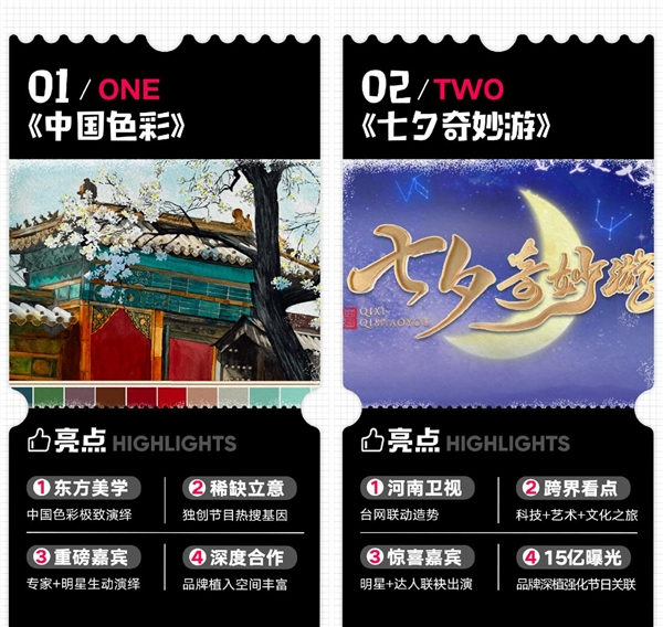 《中國色彩》是河南衛(wèi)視臺網聯動打造的傳統(tǒng)文化營銷節(jié)目,抖音攜手河南衛(wèi)視基于中國色彩打造創(chuàng)新主題,以藝人和一個色彩專家為固定搭配,講述顏色背后的傳統(tǒng)與故事,并邀請全國知名女性舞蹈家,每期演繹2-3個舞蹈節(jié)目,四大合作價值為品牌打造熱搜基因。