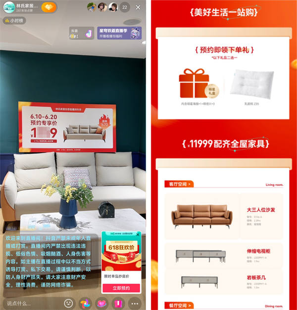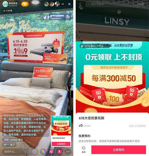 為此,在大促期間,林氏家居特意通過(guò)凸顯活動(dòng)優(yōu)惠的多種物料增加直播間大促氛圍,利用一目了然的優(yōu)惠信息吸引用戶(hù)駐足,借助包括商品介紹、稀缺性?xún)?yōu)惠劵推介等標(biāo)準(zhǔn)化、模塊化的直播話(huà)術(shù),強(qiáng)調(diào)活動(dòng)優(yōu)惠信息,加速產(chǎn)品種草,引導(dǎo)用戶(hù)領(lǐng)取優(yōu)惠進(jìn)行留資,線(xiàn)下到店購(gòu)買(mǎi)商品。