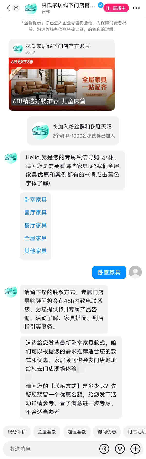在私信場(chǎng)景中,林氏家居也設(shè)置了私信回復(fù)話(huà)術(shù),借助智能客服高效地應(yīng)對(duì)私信咨詢(xún)與交流,增加用戶(hù)與品牌之間的互動(dòng)。用戶(hù)在得到及時(shí)回復(fù)和良好的服務(wù)體驗(yàn)后,更有可能積極參與活動(dòng),推動(dòng)轉(zhuǎn)化率的提高。