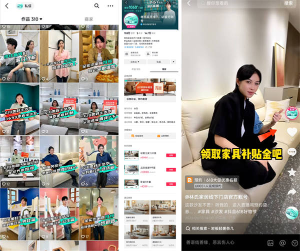 面對(duì)激烈的行業(yè)競(jìng)爭(zhēng),林氏家居提前一個(gè)月開(kāi)始籌備大促活動(dòng),以抖音為線(xiàn)上核心陣地,特別推出"618美好生活季"主題活動(dòng),參加抖音官方活動(dòng),獲得平臺(tái)多重曝光資源的加持。通過(guò)廣泛曝光,林氏家居得以持續(xù)搶占多圈層目標(biāo)用戶(hù)的注意力,提升品牌影響力。 為加強(qiáng)預(yù)熱效果,林氏家居在活動(dòng)前就發(fā)布一系列造勢(shì)視頻,展示活動(dòng)的優(yōu)勢(shì)和品牌的核心亮點(diǎn),激發(fā)用戶(hù)的參與熱情。視頻中還加入了活動(dòng)錨點(diǎn),引導(dǎo)線(xiàn)索用戶(hù)進(jìn)入活動(dòng)頁(yè)面,為后續(xù)轉(zhuǎn)化做好鋪墊。